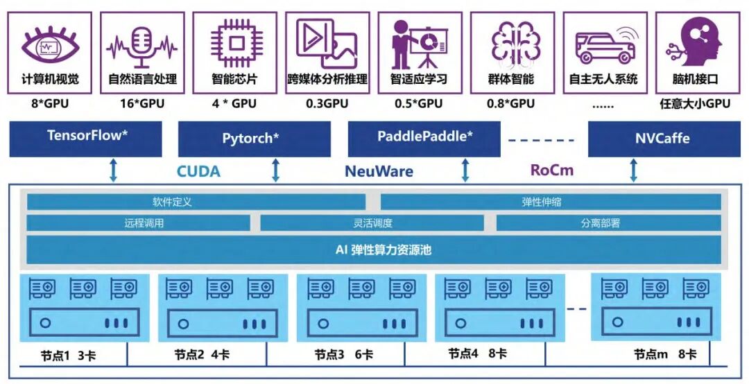 为充分利用现有 GPU 算力,将 GPU 资源池化能力扩展到整个数据中心,解耦 AI 应用和 GPU 服务器,实现弹性调度 GPU 资源。该方案兼容英伟达 CUDA 生态和国产 GPU 体系 NeuWareROCm,能建设异构的 GPU 算力集群。基于国产 GPU 生态体系,可以构建信创大模型和算力资源池。