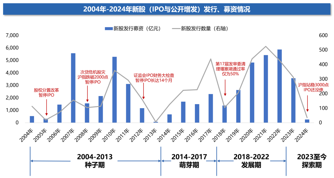 我国保荐制制度于 2004 年推出,至今已有 20 年的时间,结合 IPO 及公开增发情况,我将投行科技分为以下 4 个阶段: