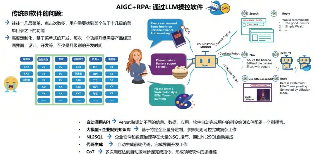 将 RPA 和 AIGC 结合,让机械手臂的动作与机械大脑的思考相互配合,自动化处理重复任务。具体场景包括自动调用 API、自然语言代替 SQL 语句、自动化生成前端代码等。