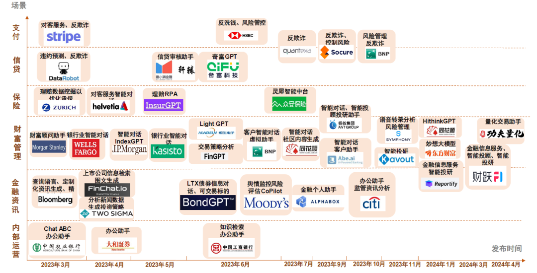 广发证券基于大模型构建企业财务风险预警模型,识别人工难以识别的潜在风险。海通证券「泛海言道」、国泰君安「灵犀布道」、东吴证券「东吴秀财 GPT」、国金证券「FinGPT」,都在探索智能投顾、智能投研、智能运营、智能风控和办公等场景应用。