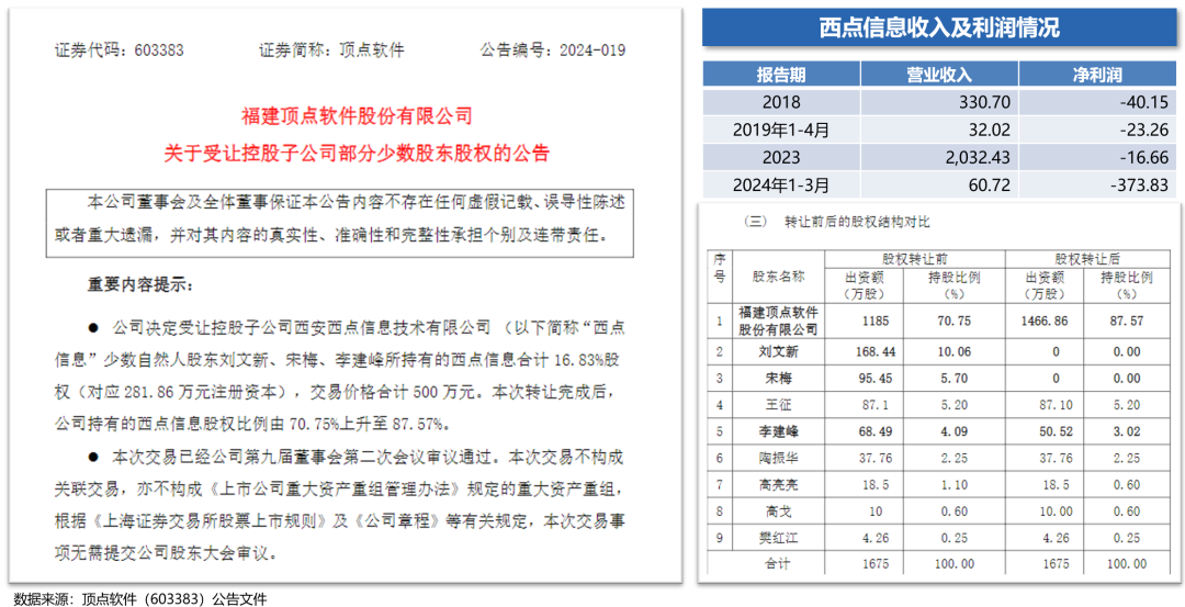 第二家是西点信息,公司主体虽然成立于 17 年 8 月,但从 11 年就开始创业了,是唯一一家从投行系统切入的创业公司,也是最早开始做投行系统的公司,2019 年 6 月,上市公司顶点软件 900 万元收购西点信息 64.74%股份,估值 1390.18 万元。2024 年 7 月,顶点拟 500 万元收购西点 16.83%股权,估值 2970.89 万元。