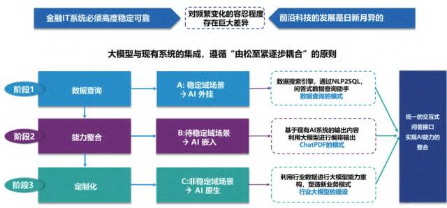证券 IT 系统必须高度稳定可靠,对大模型的容错度较低。因此,大模型与现有系统的集成应遵循由松至紧逐步耦合的原则,采用外挂式、嵌入式和原生大模型相结合的方式来进行大模型的应用。